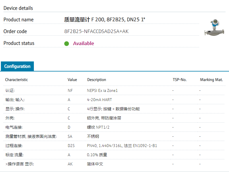 8F2B25-NFACCDSAD2SA+AK 订货号 8F2B25-4HQ3/0 扩展订货号 (8F2B25-NFACCDSAD2SA+AK) 名称 质量流量计 F 200, 8F2B15, DN15 1/2" 认证: NF NEPSI Z1 Ex ia 输出; 输入: A 4-20mA HART 显示; 操作: C 4行显示; 按键 + 数据备份功能 外壳: C 铝外壳, 带防腐涂层 电气连接: D 螺纹 NPT1/2 测量管材质, 接液表面光洁度: SA 不锈钢 过程连接: D2S PN40, 1.4404/316L, 法兰 EN1092-1-B1 标定 流量: A 0.10% 质量 >操作语言 显示: AK 简体中文
