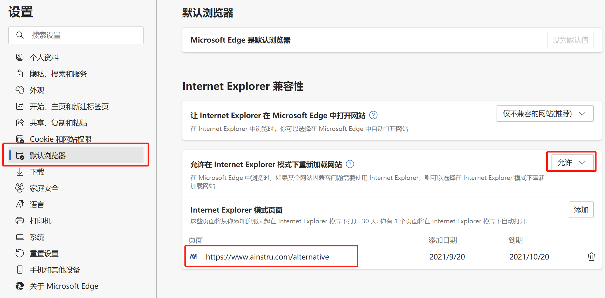 1、 在浏览器输入:edge://settings/defaultBrowser,允许在 Internet Explorer 模式下重新加载网站改成把默认改成允许, 把网址:https://www.ainstru.com/alternative 按照下图添加到IE模式里去,但是这个有30天的有效期,所以每隔30天都需要设置一次,暂时没有其他的更优的办法可以一劳永逸解决了。