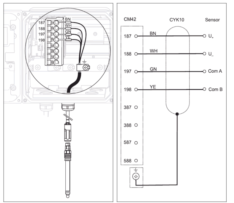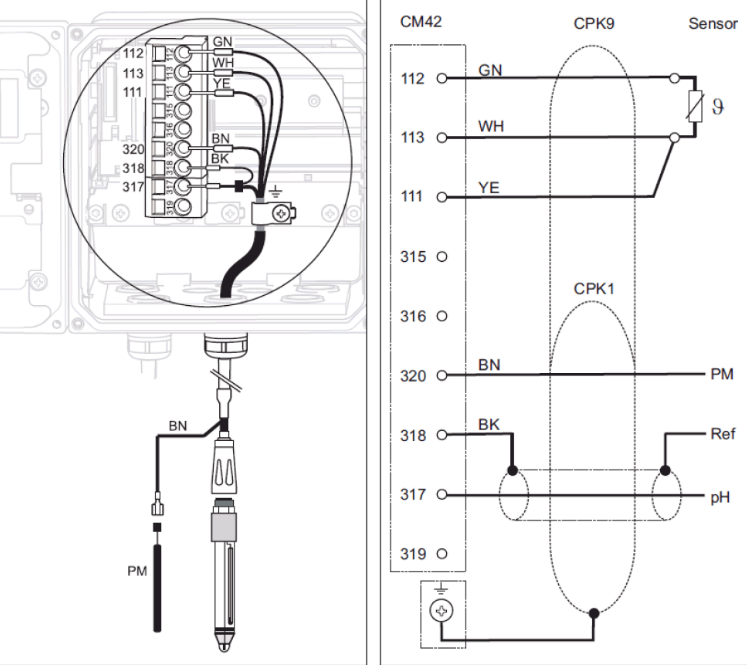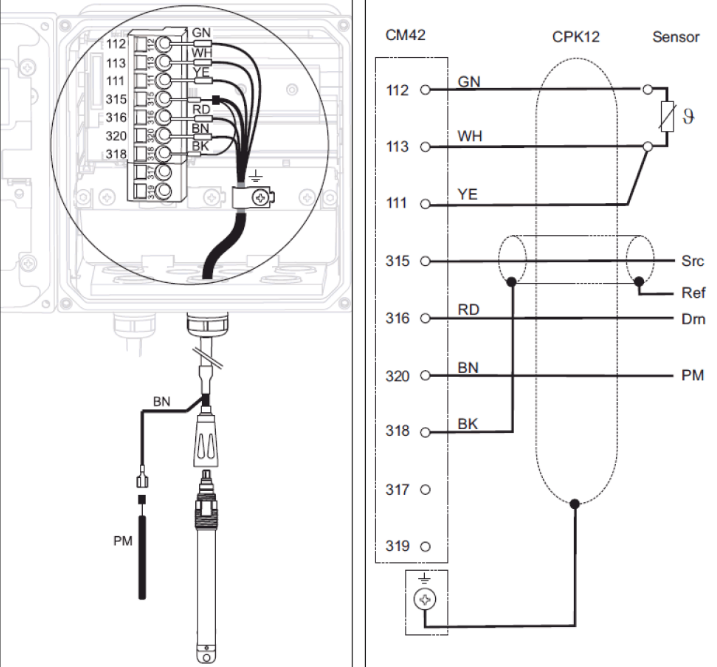 1) 绿、白、黄三根温度线分别连接112,113,111号端子。2)同轴线的芯线和黑色屏蔽线分别代表测量和参比信号,分别连接317和318端子;棕色等电势线连接到320端子。3)传感器电缆屏蔽层需接地。