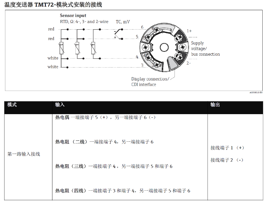 温度变送器TMT72-模块式安装的接线: