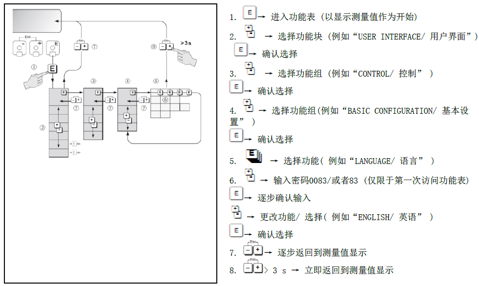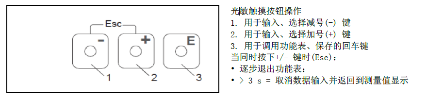 1. 用于输入、选择减号(-) 键。2.用于输入、选择加号(+) 键。3.用于调用功能表、保存的回车键当同时按下+/- 键时(Esc):(1)逐步退出功能表。(2)> 3 s = 取消数据输入并返回到测量值显示