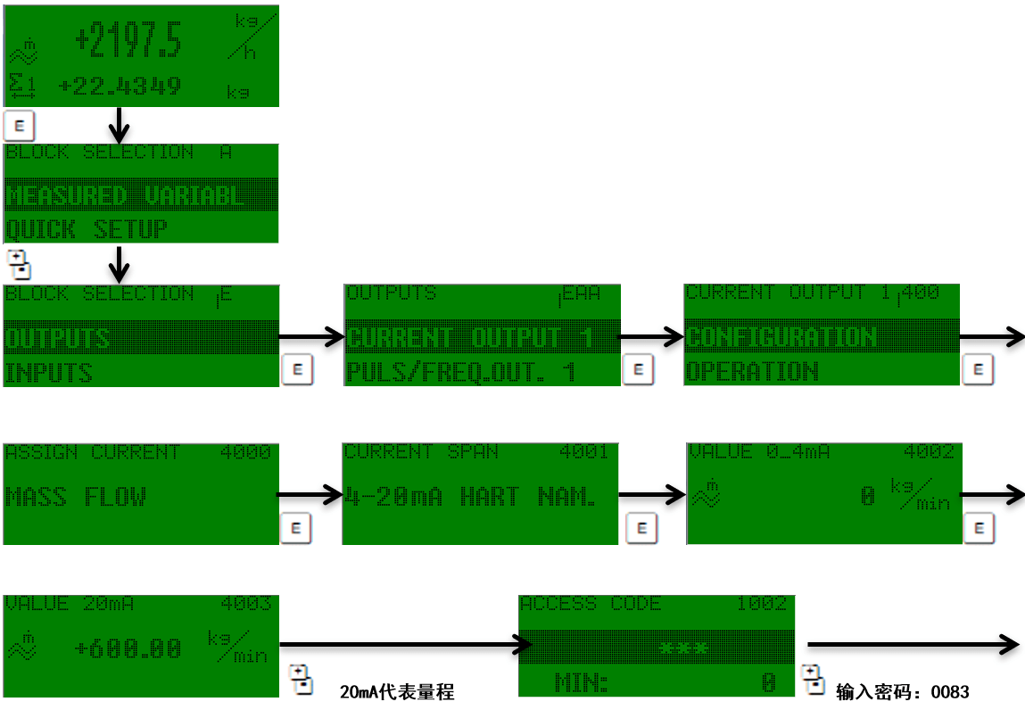 83系列的质量流量计快速设置语言、单位、电流输出、脉冲输出光敏触摸键控制:“+,-”键,“E”键。同时按“+,-”键一步步退出功能矩阵到主显示页位置,同时按“+,-”键并保持3秒以上直接回到主显示页位置,同时按“+,-”键取消数据输入。按“E”进入菜单,再按+/-键找到 OUTPUTS (输出)。修改密码:0083,也可以直接输入“83”,当从左向右数第三个“*"号变成回车键后按“E”确认就可。