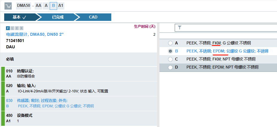 电磁流量计DMA50-AAAAA1和DMA50-AAABA1的区别