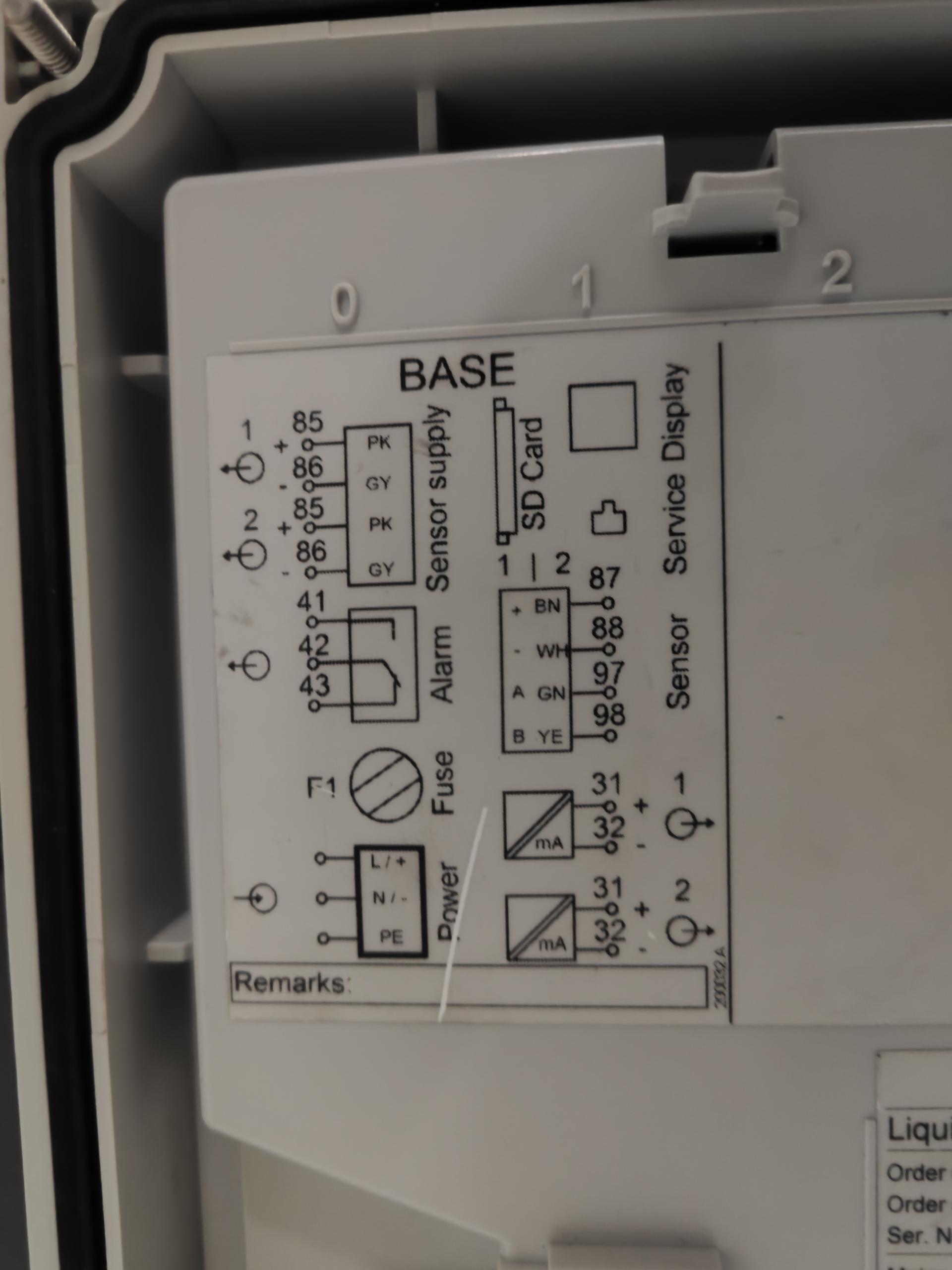 首先我们按照图示在L N处接入24V电压,N为正极、L为负极。然后将测量电缆按照棕、白、绿、黄的顺序接入87、88、97、98。再将测量电缆接入COS51E传感器开启电源就可以进行测量设置。