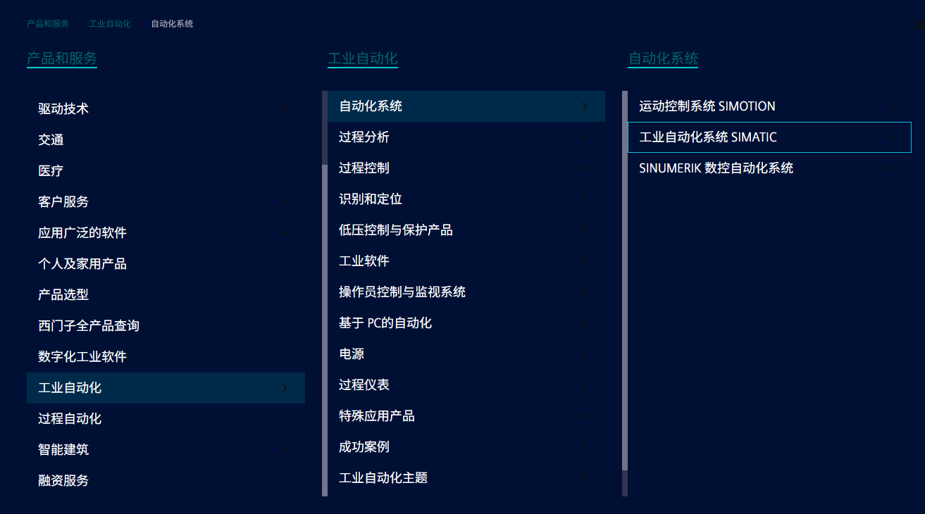 选择产品和服务,然后再选工业自动化,再选择自动化系统,最后选工业自动化系统SIMATC