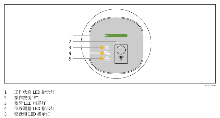可以看到上面对指示灯的解释,我们根据需求选择对应的指示灯即可。短按(< 2 s)或长按(> 2 s)操作按键E即可操作设备。短按E操作按键:在各功能参数之间切换 按下并按住E操作按键:选择功能参数 如果已选中功能参数,LED指示灯闪烁。 不同闪烁状态表示功能参数处于激活状态还是未激活状态。