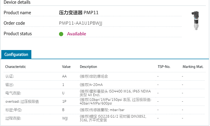 PMP11-AA1U1PBWJJ 订货号 PMP11-12P7/0 扩展订货号 (PMP11-AA1U1PBWJJ ) 名称 压力变送器 PMP11 基本描述 压力, 压阻式
