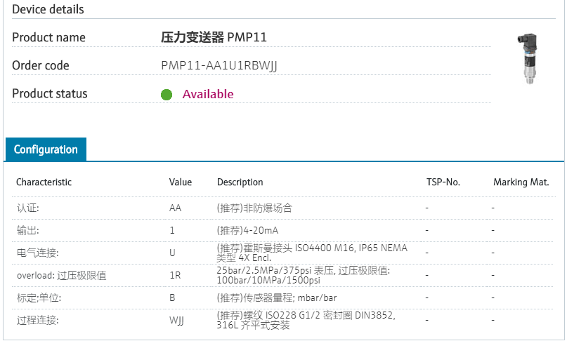 PMP11-AA1U1RBWJJ 订货号 PMP11-1D46/0 扩展订货号 (PMP11-AA1U1RBWJJ) 名称 压力变送器 PMP11 基本描述 压力, 压阻式