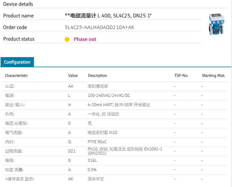 5L4C25-AALHA0AQD210A+AK 订货号 5L4C25-1V23/0 扩展订货号 (5L4C25-AALHA0AQD210A+AK) 名称 电磁流量计 L400,5L4C25,DN25 1" 防爆认证: AA 非防爆场合 电源: L 100-240VAC/24VAC/DC 输出; 输入: H 4-20mA HART, 脉冲/频率 开关输出 外壳: A 一体型, 铝外壳, 带防腐涂层 分体型电缆: 0 无 电气连接: A 电缆密封套 M20 内衬: Q PTFE 90oC 过程连接: D21 PN10, 碳钢, 松套法兰 成型钢板 EN1092-1 电极: 0 316L 标定 流量: A 0.5% >操作语言 显示: AK 简体中文 型号参数