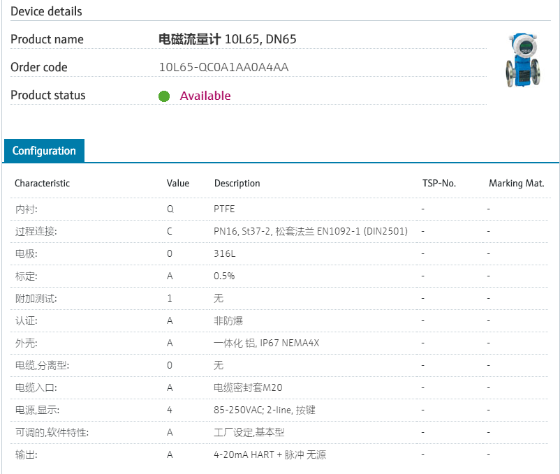 10L65-QC0A1AA0A4AA 订货号 10L65-1649/101 扩展订货号 (10L65-QC0A1AA0A4AA) 名称 电磁流量计 10L65, DN65 内衬: Q PTFE 过程连接: C PN16, St37-2, 碳钢松套法兰 EN1092-1 (DIN2501) 电极: 0 316L 标定: A 0.5% 附加测试: 1 无 认证: A 非防爆 外壳: A 一体化 铝, IP67 NEMA4X 分体型电缆: 0 无 电缆入口: A 电缆密封套M20 电源,显示: 4 85-250VAC; 2-line, 按键 出厂参数设置 A 默认设置 输出: A 4-20mA HART + 脉冲 无源 型号参数