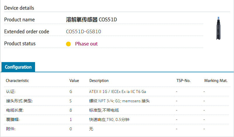 停产了,新款: COS51E-BA26TF覆膜法溶解氧传感器,快速响应型,T90. 0.5分钟,量程:0-100mg/l,防爆型,和CM42变送器连接。不防爆的请用COS51D-AS800.