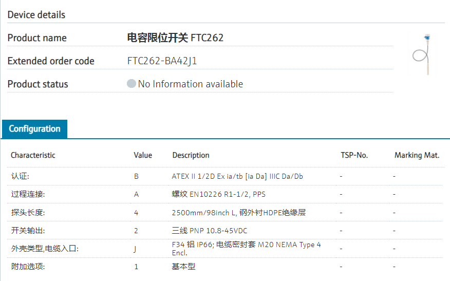 FTC262-BA42J1 扩展订货号 FTC262-BA42J1 名称 电容限位开关 FTC262 基本描述 点式物位传感器, 电容