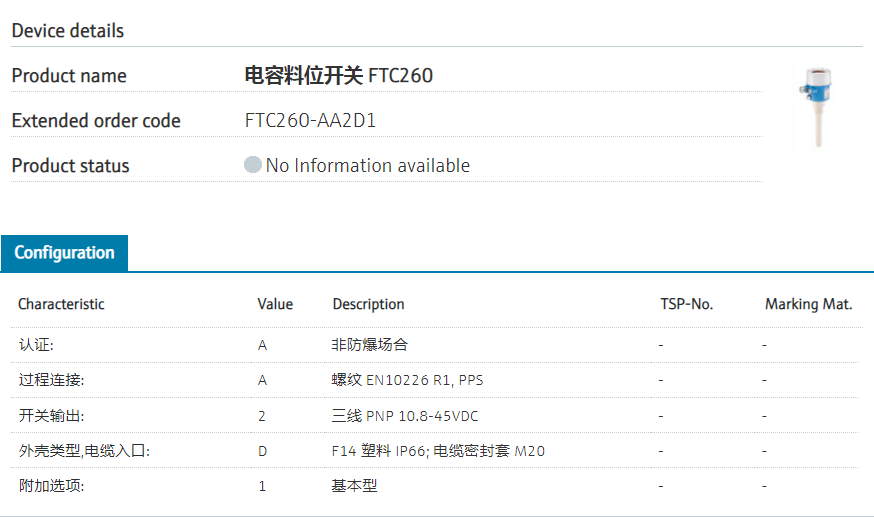 FTC260-AA4D1常用现货,带继电器输出,R1螺纹连接,适用于常温常压,例如储量料仓。