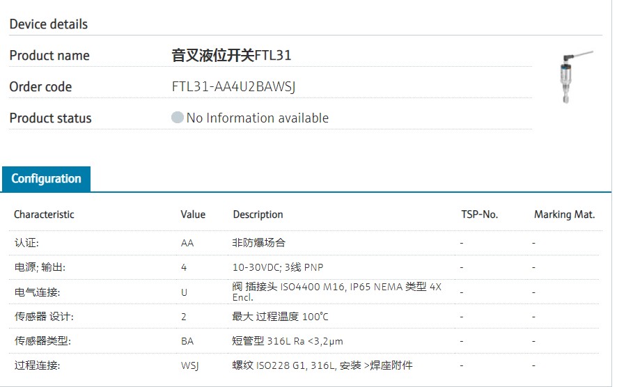 FTL31-AA4U2BAWSJ 订货号 FTL31-12U4/0 扩展订货号 (FTL31-AA4U2BAWSJ) 名称 音叉液位开关FTL31 基本描述 点式物位仪 音叉震动式