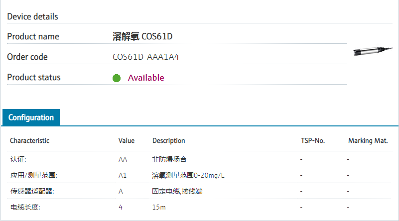 COS61D-AAA1A4 订货号 COS61D-1009/0 扩展订货号 (COS61D-AAA1A4) 名称 溶解氧 COS61D 基本描述 Dissolved oxygen sensor; optical.