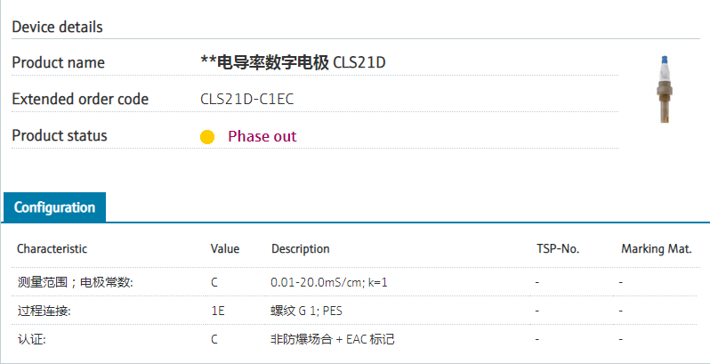 CLS21D-C1EC 扩展订货号 CLS21D-C1EC 名称 ***电导率数字电极 CLS21D 基本描述 Conductivity 2 electrode sensor