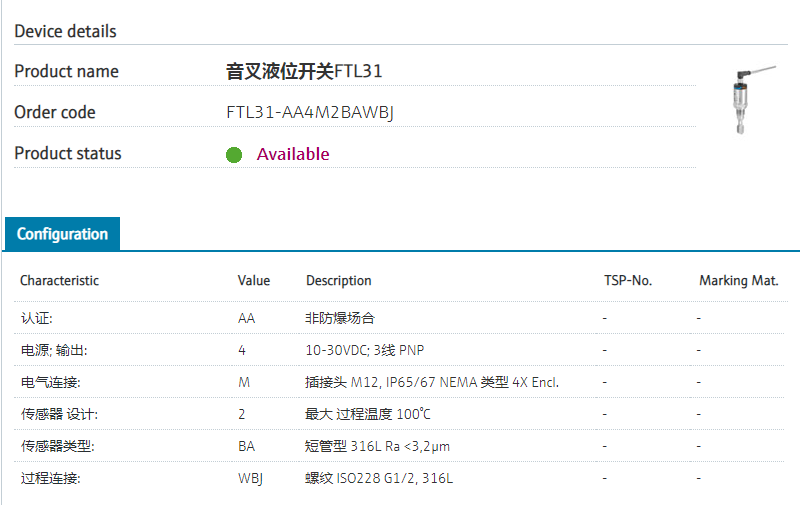 FTL31-AA4M2BAWBJ 订货号 FTL31-1077/0 扩展订货号 (FTL31-AA4M2BAWBJ) 名称 音叉液位开关FTL31 基本描述 点式物位仪 音叉震动式