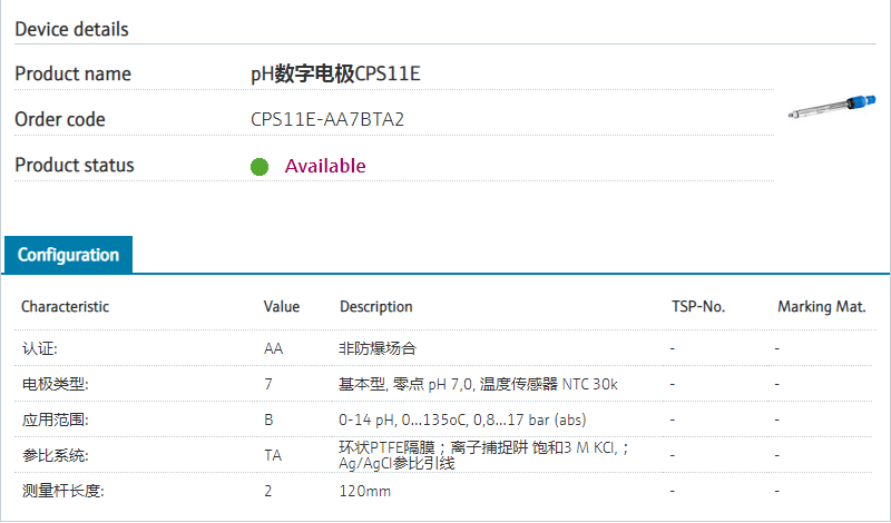 CPS11E-AA7BTA2 订货号 CPS11E--10K6/0 扩展订货号 (CPS11E-AA7BTA2) 名称 pH数字电极CPS11E 基本描述 pH glass comb. sensor, Memosens 2.0.