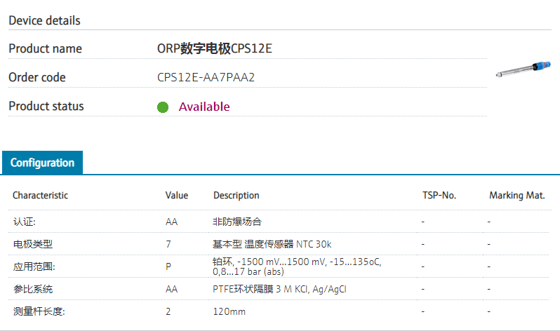CPS12E-AA7GAA2 替代CPS12D-7PA21 最常用的ORP电极,测量范围-1500...+1500 mV , -15...135oC, 0.8...17 bar (abs)带PTFE环状隔膜