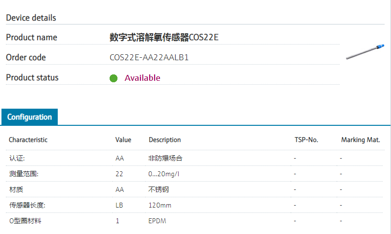 :: Easy handling and installation认证: AA 非防爆场合 测量范围: 22 0...20mg/l 材质 AA 不锈钢 传感器长度: LB 120mm O型圈材料 1 EPDM