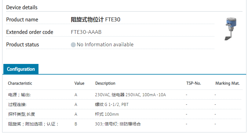 FTE30-AAAB 扩展订货号 FTE30-AAAB 名称 **阻旋式物位计 FTE30 基本描述 Level limt switch, paddel.