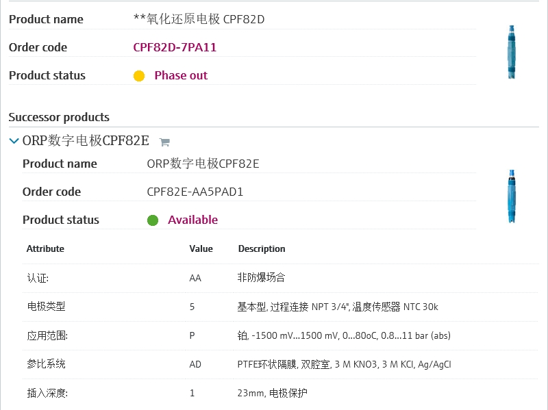 CPF82E-AA5PAD1 订货号 CPF82E-1009/0 扩展订货号 (CPF82E-AA5PAD1) 名称 ORP数字电极CPF82E 基本描述 ORP comb. sensor, Memosens 2.0.