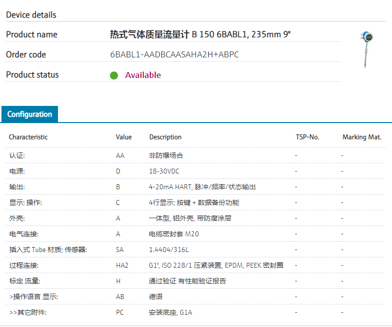 monitoring of utility gases.认证: AA 非防爆场合 电源: D 18-30VDC 输出: B 4-20mA HART, 脉冲/频率/状态输出 显示; 操作: C 4行显示; 按键 + 数据备份功能 外壳: A 一体型, 铝外壳, 带防腐涂层 电气连接: A 电缆密封套 M20 插入式 Tube 材质; 传感器: SA 1.4404/316L 过程连接: HA2 G1", ISO 228/1 压紧装置, EPDM, PEEK 密封圈 标定 流量: H 通过验证 有性能验证报告