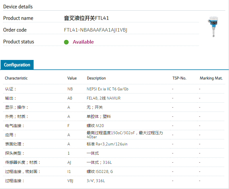 independent of built up.认证: NB NEPSI Ex ia IIC T6 Ga/Gb+中国CCC标记 输出: A8 FEL48, 2线 NAMUR 显示;操作: A 无;开关 外壳;材质: A 单腔体;塑料 电气连接: F 螺纹 M20 应用: A 最高过程温度150oC/302oF,最大过程压力40bar 表面处理: A Standard Ra<3,2um/126uin 探头类型: 1 一体式 传感器长度;材质: AJ 一体式;316L 过程连接,密封面: I1 螺纹 ISO228, G 过程连接: VBJ 3/4", 316L