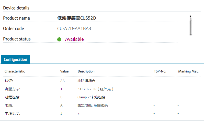 ::compatible with Liquiline CM44认证: AA 非防爆场合 测量方法: 1 ISO 7027, IR(红外光) 过程连接: B Clamp 2”卡箍连接 电缆: A 固定电缆, 带接线头 电缆长度: 3 7m