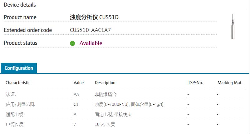 Factory calibration认证: AA 非防爆场合 应用/测量范围: C1 浊度(0-4000FNU); 固体含量(0-4g/l) 适配电缆: A 固定电缆; 带接线头 电缆长度: 7 ..... m 长度