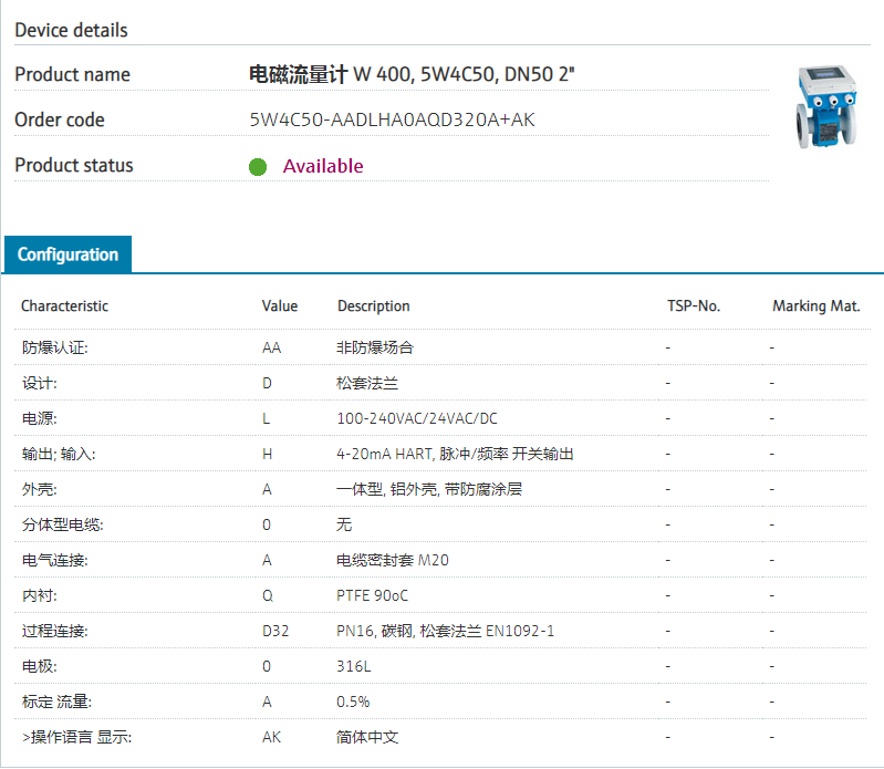 5W4C50-AADLHA0AQD320A+AK 订货号 5W4C50-KNT9/0 扩展订货号 (5W4C50-AADLHA0AQD320A+AK) 名称 电磁流量计 W 400, 5W4C50, DN50 2" 防爆认证: AA 非防爆场合 设计: D 松套法兰 电源: L 100-240VAC/24VAC/DC 输出; 输入: H 4-20mA HART, 脉冲/频率 开关输出 外壳: A 一体型, 铝外壳, 带防腐涂层 分体型电缆: 0 无 电气连接: A 电缆密封套 M20 内衬: Q PTFE 90oC 过程连接: D32 PN16, 碳钢, 松套法兰 EN1092-1 电极: 0 316L 标定 流量: A 0.5% >操作语言 显示: AK 简体中文