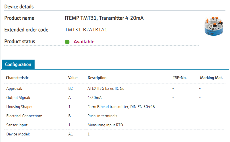 Mounting: head form B, DIN EN50446.Approval: B2 ATEX II3G Ex ec IIC Gc Output Signal: A 4-20mA Housing Shape: 1 Form B head transmitter, DIN EN 50446 Electrical Connection: B Push-in terminals Sensor Input: 1 Measuring input RTD Device Model: A1 1