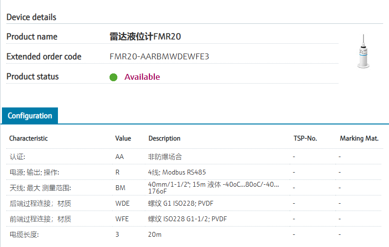 IP68/NEMA6P.认证: AA 非防爆场合 电源; 输出; 操作: R 4线; Modbus RS485 天线; 最大 测量范围: BM 40mm/1-1/2"; 15m 液体 -40oC...80oC/-40…176oF 后端过程连接;材质 WDE 螺纹 G1 ISO228; PVDF 前端过程连接;材质 WFE 螺纹 ISO228 G1-1/2; PVDF 电缆长度: 3 20m
