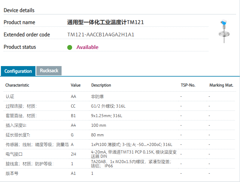316L.认证 AA 非防爆 过程连接;材质: CC G1/2 外螺纹; 316L 套管直径,材质: B1 9x1.25mm; 316L 插入深度U: A4 100 mm 延长颈长度T: G 80 mm 传感器;线制;精度等级;测量范围;材质: A 1xPt100 薄膜式; 3-线; A; -50...+200oC; 316L 电气接口 2H 4-20mA, 单通道TMT31 PCP 0.15K, 模块温度变送器 DIN 接线盒;材质;防护等级: 1 TA20AB,1x M20x1.5内螺纹,紧凑型旋盖;铸铝; IP66 版本号 A1 1