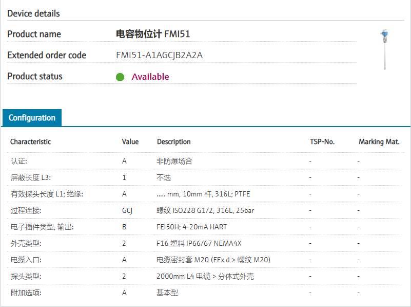 FMI51-A1AGCJB2A2A 扩展订货号 FMI51-A1AGCJB2A2A 名称 电容物位计 FMI51 基本描述 Level measurement, capacitance,