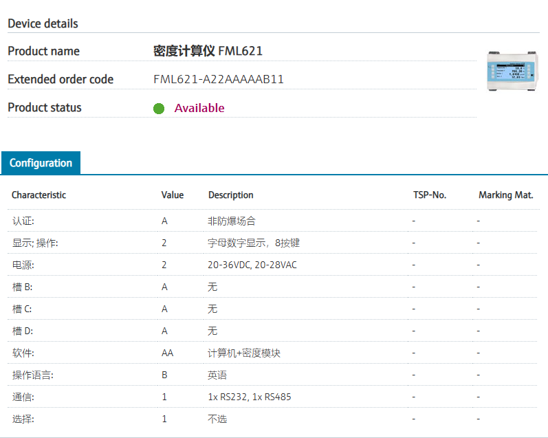 Output E: 2x 0/4-20mA.认证: A 非防爆场合 显示; 操作: 2 字母数字显示,8按键 电源: 2 20-36VDC, 20-28VAC 槽 B: A 无 槽 C: A 无 槽 D: A 无 软件: AA 计算机+密度模块 操作语言: B 英语 通信: 1 1x RS232, 1x RS485 选择: 1 不选