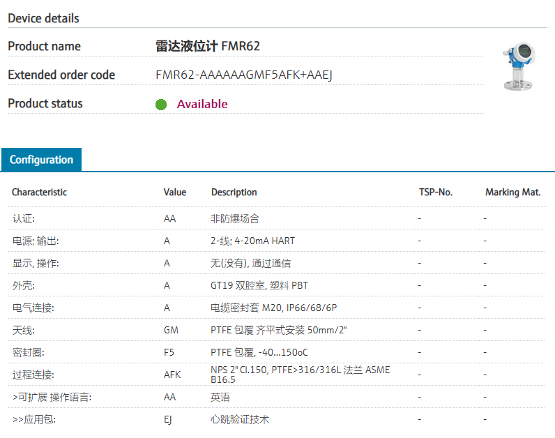 FMR62-AAAAAAGMF5AFKAAEJ 订货号 FMR62-MW31/0 扩展订货号 (FMR62-AAAAAAGMF5AFK+AAEJ) 名称 **雷达液位计 FMR62 基本描述 "Product being phased out - Limited