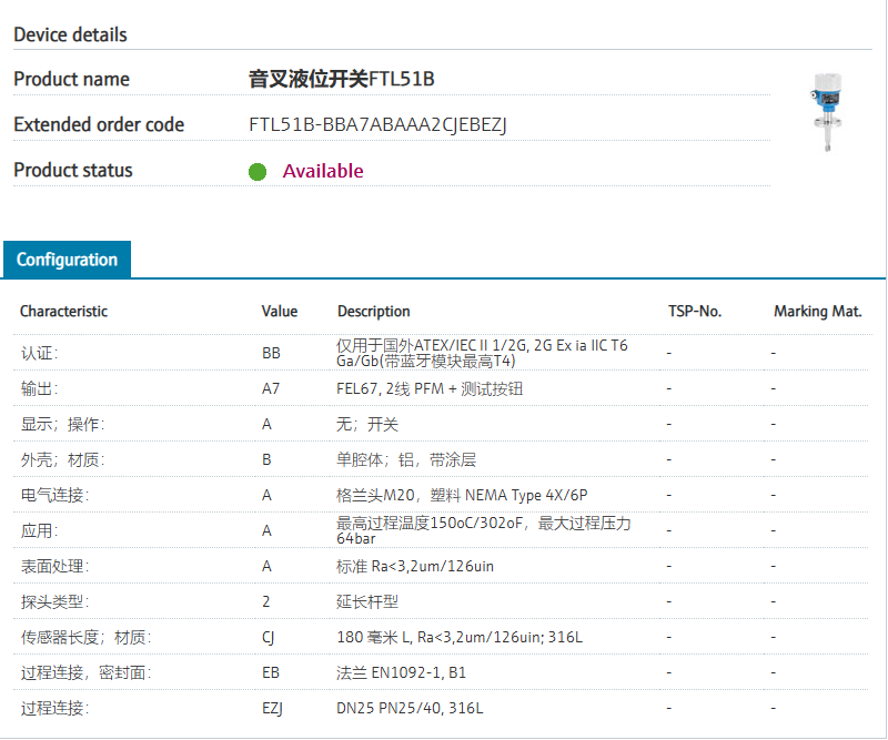 :: Measure directly in the tank / pipe.认证: BB 仅用于国外ATEX/IEC II 1/2G, 2G Ex ia IIC T6 Ga/Gb(带蓝牙模块最高T4) 输出: A7 FEL67, 2线 PFM + 测试按钮 显示;操作: A 无;开关 外壳;材质: B 单腔体;铝,带涂层 电气连接: A 格兰头M20,塑料 NEMA Type 4X/6P 应用: A 最高过程温度150oC/302oF,最大过程压力64bar 表面处理: A 标准 Ra<3,2um/126uin 探头类型: 2 延长杆型 传感器长度;材质: CJ ..... mm L, Ra<3,2um/126uin; 316L 过程连接,密封面: EB 法兰 EN1092-1, B1 过程连接: EZJ DN25 PN25/40, 316L