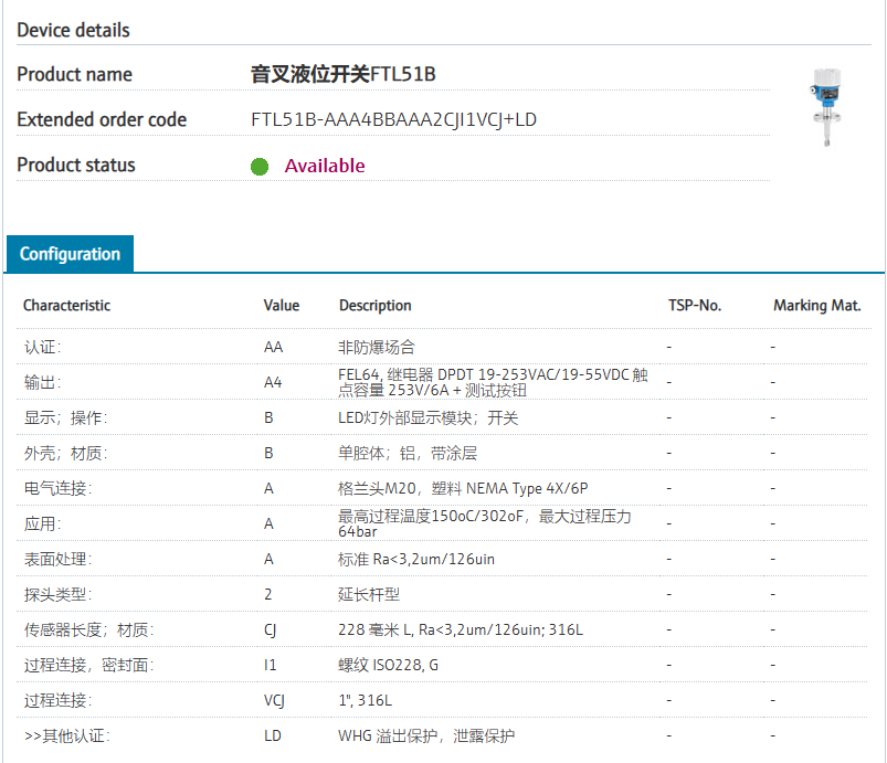 FTL51B-AAA4BBAAA2CJI1VCJLD 订货号 FTL51B-3JFH4/0 扩展订货号 (FTL51B-AAA4BBAAA2CJI1VCJLD) 名称 音叉液位开关FTL51B 基本描述 Point level/density, vibronic.