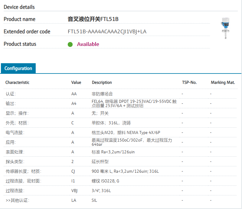 FTL51B-AAA4ACAAA2CJI1VBJLA 订货号 FTL51B-3W373/0 扩展订货号 (FTL51B-AAA4ACAAA2CJI1VBJLA) 名称 音叉液位开关FTL51B 基本描述 Point level/density, vibronic.