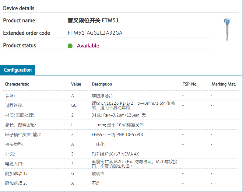 FTM51-AGG2L2A32GA 订货号 FTM51-AGG2L2A32GA 名称 音叉限位开关 FTM51 基本描述 Level limit switch, vibration.