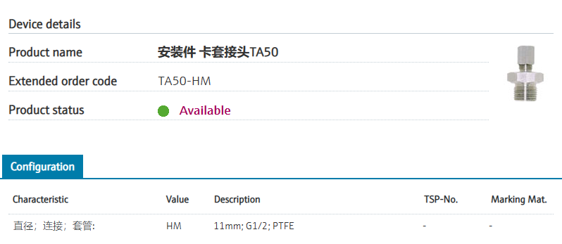 安装件 卡套接头,直径; 连接; 套管: .11mm; G1 / 2; PTFE。