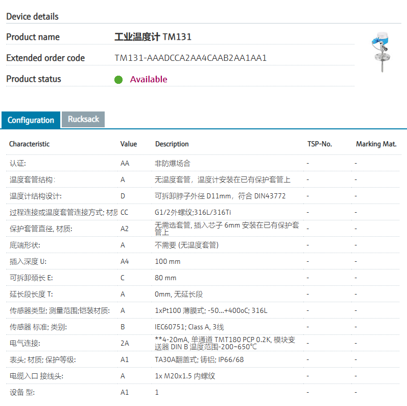 TM131-AAADCCA2AA4CAAB2AA1AA1 订货号 TM131-236N2/115 扩展订货号 (TM131-AAADCCA2AA4CAAB2AA1AA1) 名称 工业温度计 TM131 基本描述 Modular thermometer with resistance