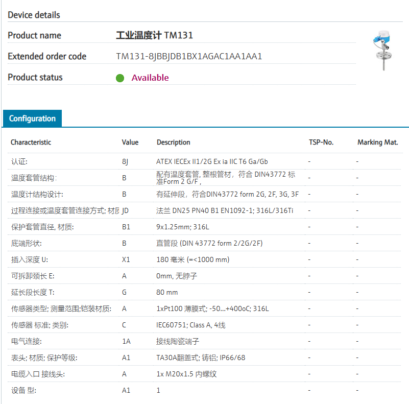 of applications.认证: 8J ATEX IECEx II1/2G Ex ia IIC T6 Ga/Gb 温度套管结构: B 配有温度套管, 整根管材,符合 DIN43772 标准Form 2 G/F , 温度计结构设计: B 有延伸段,符合DIN43772 form 2G, 2F, 3G, 3F 过程连接或温度套管连接方式; 材质: JD 法兰 DN25 PN40 B1 EN1092-1; 316L/316Ti 保护套管直径, 材质: B1 9x1.25mm; 316L 底端形状: B 直管段 (DIN 43772 form 2/2G/2F) 插入深度 U: X1 ..... mm (=<1000 mm) 可拆卸颈长 E: A 0mm, 无脖子 延长段长度 T: G 80 mm 传感器类型; 测量范围;铠装材质: A 1xPt100 薄膜式; -50...+400oC; 316L 传感器 标准; 类别: C IEC60751; Class A, 4线 电气连接: 1A 接线陶瓷端子 表头; 材质; 保护等级: A1 TA30A翻盖式; 铸铝; IP66/68 电缆入口 接线头: A 1x M20x1.5 内螺纹 设备 型: A1 1