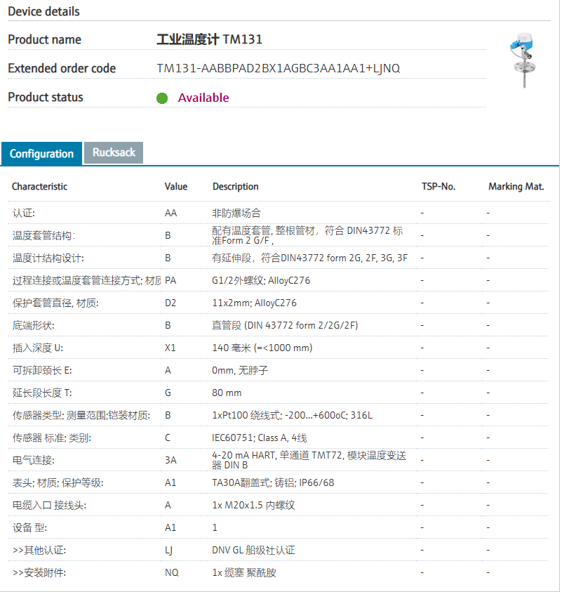 of applications.认证: AA 非防爆场合 温度套管结构: B 配有温度套管, 整根管材,符合 DIN43772 标准Form 2 G/F , 温度计结构设计: B 有延伸段,符合DIN43772 form 2G, 2F, 3G, 3F 过程连接或温度套管连接方式; 材质: PA G1/2外螺纹; AlloyC276 保护套管直径, 材质: D2 11x2mm; AlloyC276 底端形状: B 直管段 (DIN 43772 form 2/2G/2F) 插入深度 U: X1 ..... mm (=<1000 mm) 可拆卸颈长 E: A 0mm, 无脖子 延长段长度 T: G 80 mm 传感器类型; 测量范围;铠装材质: B 1xPt100 绕线式; -200...+600oC; 316L 传感器 标准; 类别: C IEC60751; Class A, 4线 电气连接: 3A 4-20 mA HART, 单通道 TMT72, 模块温度变送器 DIN B 表头; 材质; 保护等级: A1 TA30A翻盖式; 铸铝; IP66/68 电缆入口 接线头: A 1x M20x1.5 内螺纹 设备 型: A1 1 >>其他认证: LJ DNV GL 船级社认证 >>安装附件: NQ 1x 缆塞 聚酰胺