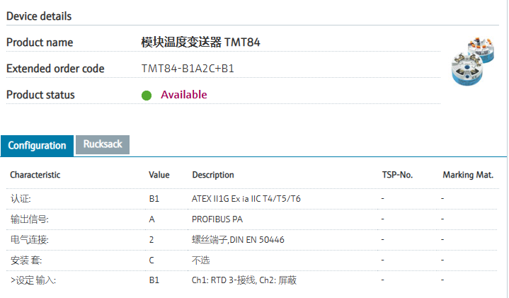 selectable.认证: B1 ATEX II1G Ex ia IIC T4/T5/T6 输出信号: A PROFIBUS PA 电气连接: 2 螺丝端子,DIN EN 50446 安装 套: C 不选 >设定 输入: B1 Ch1: RTD 3-接线, Ch2: 屏蔽