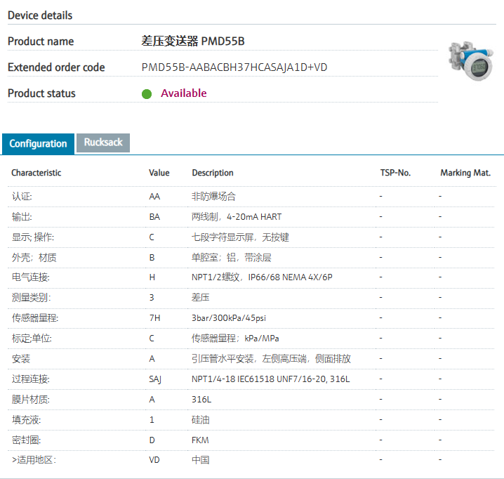 via Bluetooth (optional).认证: AA 推荐”非防爆场合 输出: BA “推荐”两线制,4-20mA HART 显示; 操作: C 七段字符显示屏,无按键/td> 外壳;材质 B “推荐”单腔室;铝,带涂层 电气连接: H “推荐”NPT1/2螺纹,IP66/68 NEMA 4X/6P 测量类别: 3 “推荐”差压 传感器量程: 7H “推荐”3bar/300kPa/45psi 标定;单位: C “推荐”传感器量程;kPa/MPa 安装 A 引压管水平安装,左侧高压端,侧面排放 过程连接: SAJ “推荐”NPT1/4-18 IEC61518 UNF7/16-20, 316L 膜片材质: A “推荐”316L 填充液: 1 “推荐”硅油 密封圈: D “推荐”FKM >适用地区: VD 中国