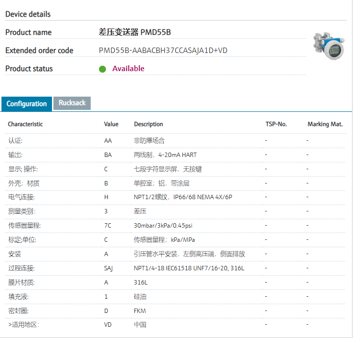 via Bluetooth (optional).认证: AA 推荐”非防爆场合 输出: BA “推荐”两线制,4-20mA HART 显示; 操作: C 七段字符显示屏,无按键/td> 外壳;材质 B “推荐”单腔室;铝,带涂层 电气连接: H “推荐”NPT1/2螺纹,IP66/68 NEMA 4X/6P 测量类别: 3 “推荐”差压 传感器量程: 7C “推荐”30mbar/3kPa/0.45psi 标定;单位: C “推荐”传感器量程;kPa/MPa 安装 A 引压管水平安装,左侧高压端,侧面排放 过程连接: SAJ “推荐”NPT1/4-18 IEC61518 UNF7/16-20, 316L 膜片材质: A “推荐”316L 填充液: 1 “推荐”硅油 密封圈: D “推荐”FKM >适用地区: VD 中国