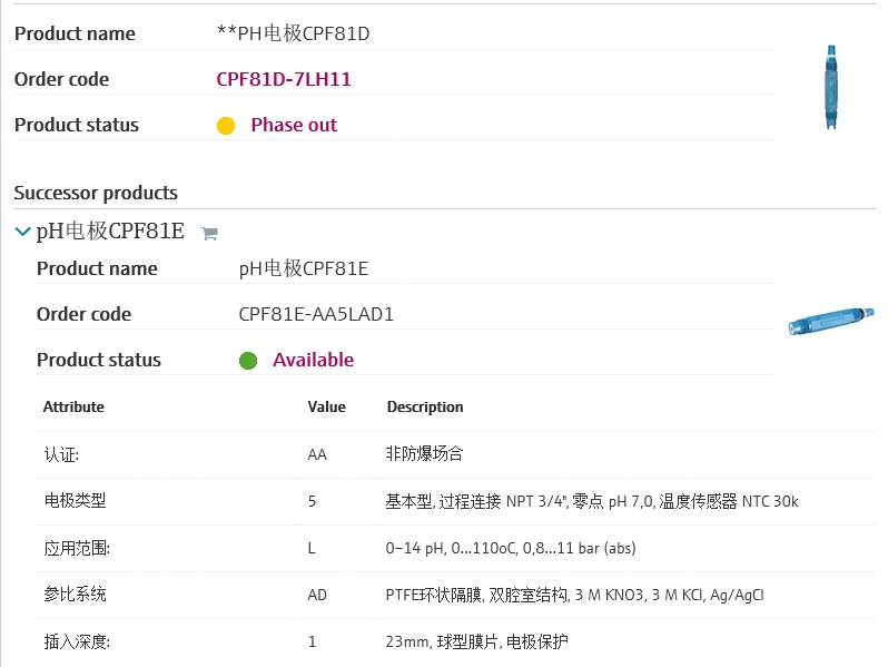 CPS11D-7BT21 0-14pH, 0-135℃, 16 bar; 离子捕捉阱,主要用于化工场合。防爆的型号为CPS11D-7BT2G, 已经进入退市阶段,新款是 CPS11E-AA7BTA2 | CPS11E-10K6/0