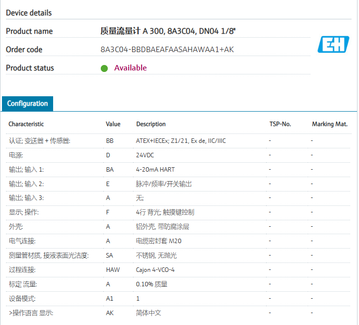 transmitter.认证; 变送器 + 传感器: BB ATEX+IECEx; Z1/21, Ex de, IIC/IIIC 电源: D 24VDC 输出; 输入 1: BA 4-20mA HART 输出; 输入 2: E 脉冲/频率/开关输出 输出; 输入 3: A 无; 显示; 操作: F 4行 背光; 触摸键控制 外壳: A 铝外壳, 带防腐涂层 电气连接: A 电缆密封套 M20 测量管材质, 接液部分表面光洁度: SA 不锈钢, 无抛光 过程连接: HAW Cajon 4-VCO-4 标定 流量: A 0.10% 质量 设备模式: A1 1 >操作语言 显示: AK 简体中文